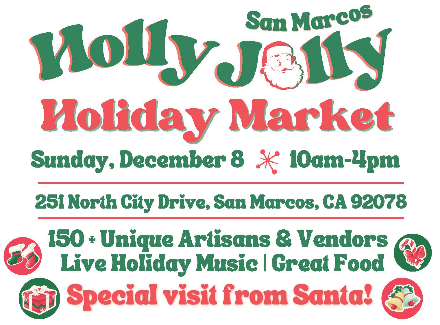 The San Marcos Chamber of Commerce is thrilled to present the 5th Annual San Marcos “Holly Jolly” Holiday Market at North City! Get ready for a day packed with festive fun, holiday cheer, and shopping galore.