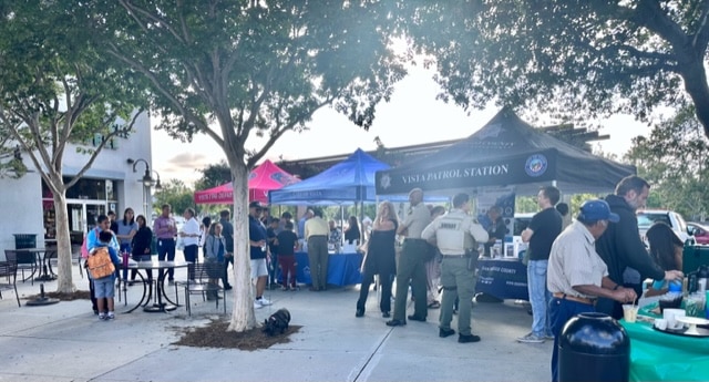 Thursday evening, on 30 Main Street, in the Vista Village, the Mayor and City Council member and city staff, joined forces with the Vista Sheriffs station and the Vista Fire Fighters to host a coffee with the community event. Families enjoyed talking with the firefighters and sheriff deputies and gathered swag while interacting with them.