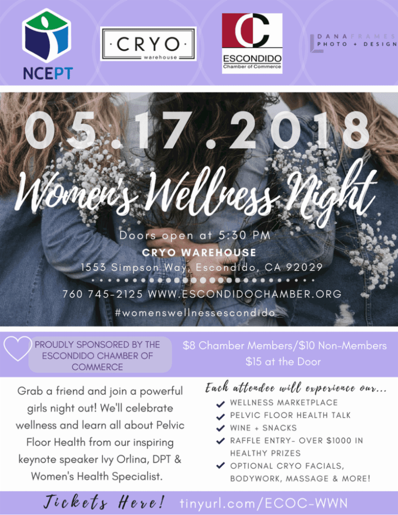 The evening will include a wellness marke, pelvic floor health talk, great raffle prizes, wine and appetizers.