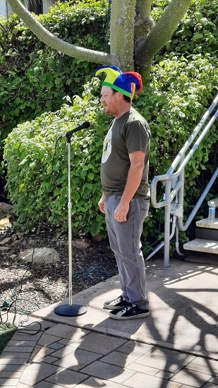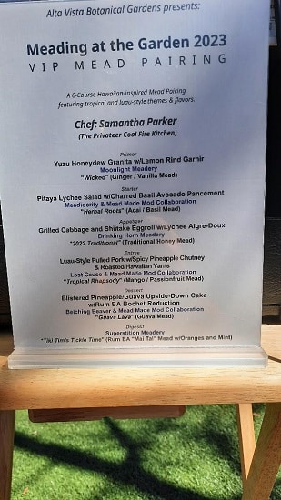 One of the fun events that has grown in popularity over the years is the VIP Mead Pairing luncheon, enabling those signing up to enter an hour and fifteen minutes earlier than the noon opening and this year enjoying a 6-course Hawaiian-inspired Mead pairing featuring tropical and luau-style themes and flavors. The Chef for this luncheon was Samantha Parker from The Privateer Coal Fire Kitchen in Oceanside. This luncheon kicked off with Dave Nichols, organizer for the event. Dave welcomed everyone at the luncheon, which was held in the Rose Garden, just outside of the Garden House. The food was prepared inside the Garden House and served by volunteers. The luncheon appeared to be sold out as the majority of the seating at the circular tables was taken by those who paid to enjoy this amazing luncheon. The menu for this year included a Primer of Yuzu Honeydew Granita with Lemon Rind Garnir paired with a Ginger Vanilla Mead from Moonlight Meadery. Next was a Starter of Pitaya Lychee Salad with Charred Basil Avocado Pancement paired with an Acai Basil Mead from Mediocrity & Mead Made Mod Collaboration. The Appetizer was Grilled Cabbage and Shiitake Eggroll with Lychee Aigre-Doux paired with a Traditional Honey Mead from Drinking Horn Meadery. The Entrée was Luau-Style Pulled Pork with Spicy Pineapple Chutney and Roasted Hawaiian Yams paired with a Mango Passionfruit Mead from Lost Cause Meadery & Mead Made Mod Collaboration. The Dessert was Blistered Pineapple/Guava Upside-Down Cake with Rum BA Bochet Reduction paired with a Guava Mead from Belching Beaver Brewing & Mead Made Mod Collaboration. Finishing this amazing luncheon, those attending enjoyed a Digestif of a Rum BA “Mai-Tai” Mead with Oranges and Mint from Superstition Meadery. The luncheon wrapped up around 1:15 pm so those attending could enjoy the rest of the day in the Gardens.