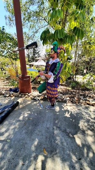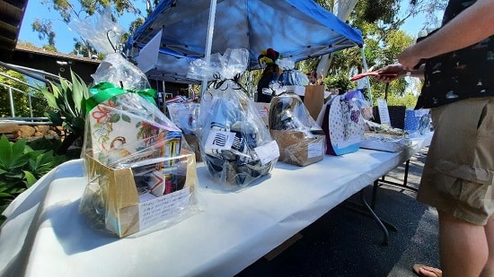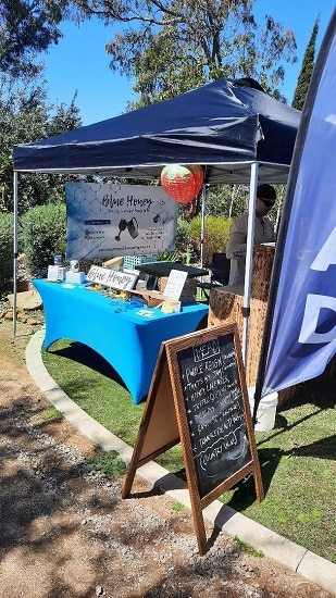 Just outside of the front of the Garden House, you could stop by and purchase raffle tickets to try and win a variety of baskets put together with donations from a host of the breweries and meaderies taking part in today’s event. As those who had purchased tickets began to enter at noon, checking in and receiving their tasting glass, the patrons walked past the food tents and a food truck offering a variety of food choices for purchase. Drop Outs Pizza, Sticky Chicken, Aunty Devi’s Meat Pies and Bread and Cheese offered numerous choices. The bright pink Baby’s Burgers Food Truck offered a variety of burger options. My son, Brian, tried a rice bowl from Sticky Chicken which he enjoyed. I had a sausage roll and meat pie from Aunty Devi’s, also tasty. Patrons then walked up the pathway to begin to see the numerous tents with the wineries, meaderies, breweries and other businesses offering samples of what their companies offered. Most of the 30 meaderies, breweries and wineries offered at least two selections to choose from. Some of the names of their selections are unusual, such as Rumpleplumskin from Superstition, Chasing Alice Date Shake from Lost Cause, Toffee Scotch from Blue Honey, Hazed and Confused from Arcane and Alfalfa Honey from Raging Cider & Mead. This was Blue Honey’s first-time taking part in “Meading at the Garden”.