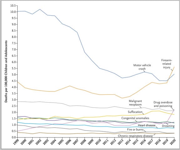 Figure 1: Leading Causes of Death among Children and Adolescents ages 1-19 in the United States, 1999 through 2020.