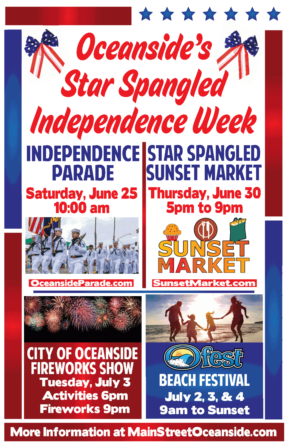–Oceanside’s Independence Week events, besides the parade, will include the Ofest Beach Festival July 2, 3 and 4 and the city fireworks July 3.
