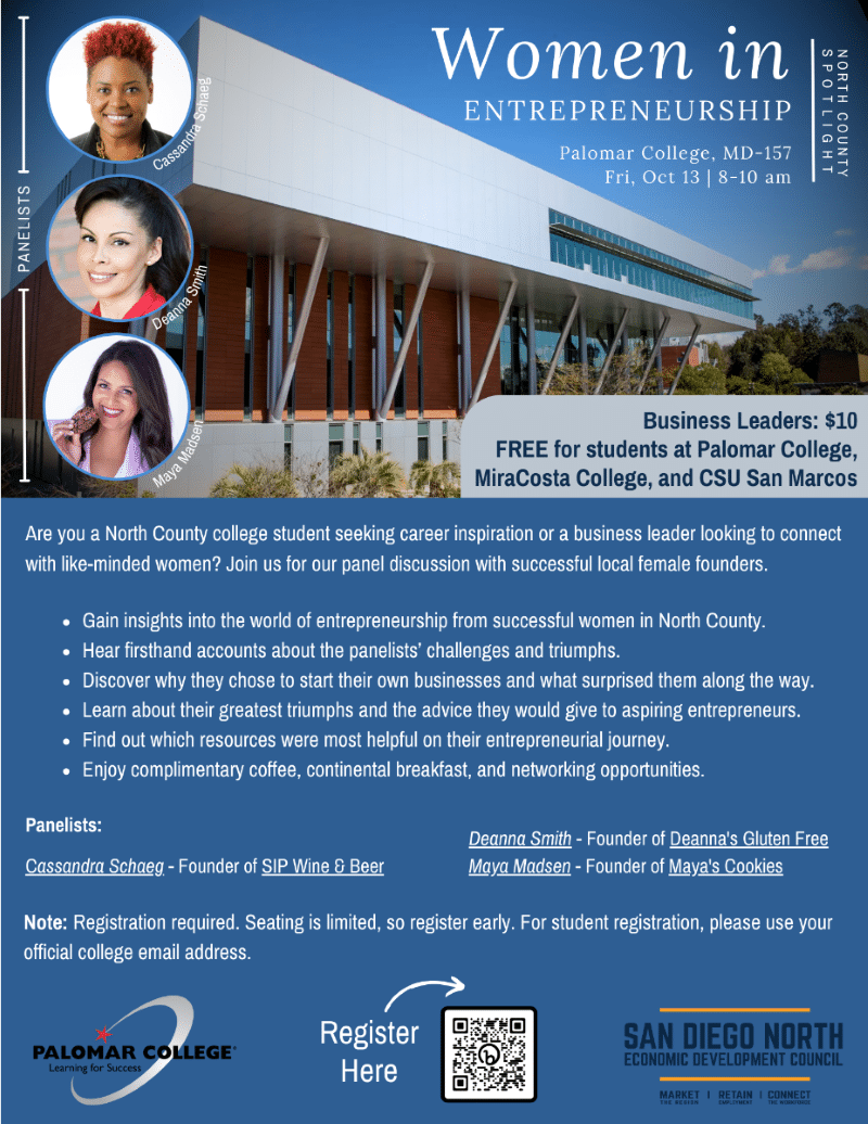 Are you a North County college student seeking career inspiration or a business leader looking to connect with like-minded women? Join us for our panel discussion with successful local female founders.