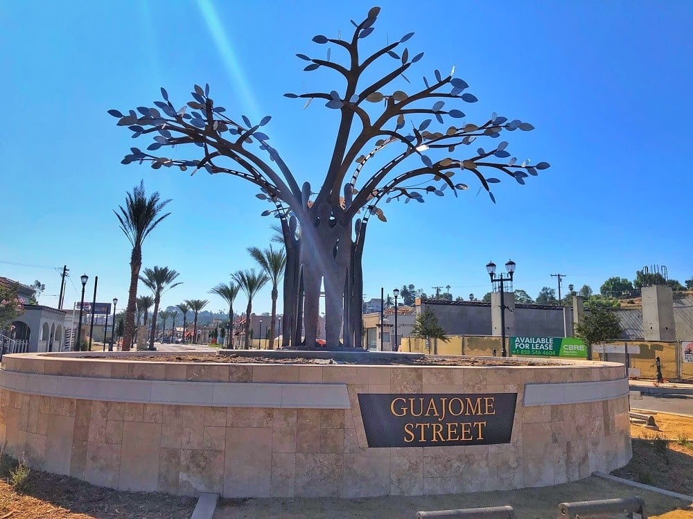 The improvements include landscaping, sidewalks, lighting, new sewer lines, storm drain facilities and water lines, while overhead utility lines were placed underground. The project also includes a total of three roundabouts and three sculptures created by local artists.